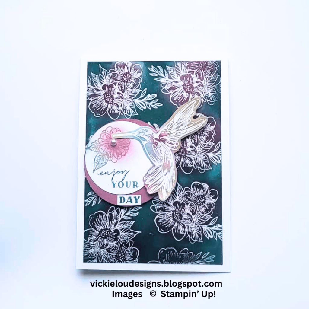 Finally its Victoria Littlewood of http://www.vickieloudesigns.blogspot.com Vickie has created this who used the ‘Emboss Resist Technique’ to create this lovely card. Vickie used the ‘Thoughtful Expressions; Stamp set and created a dramatic background, with a softer coloured humming bird as a focal point elevated and off set from the sentiment.