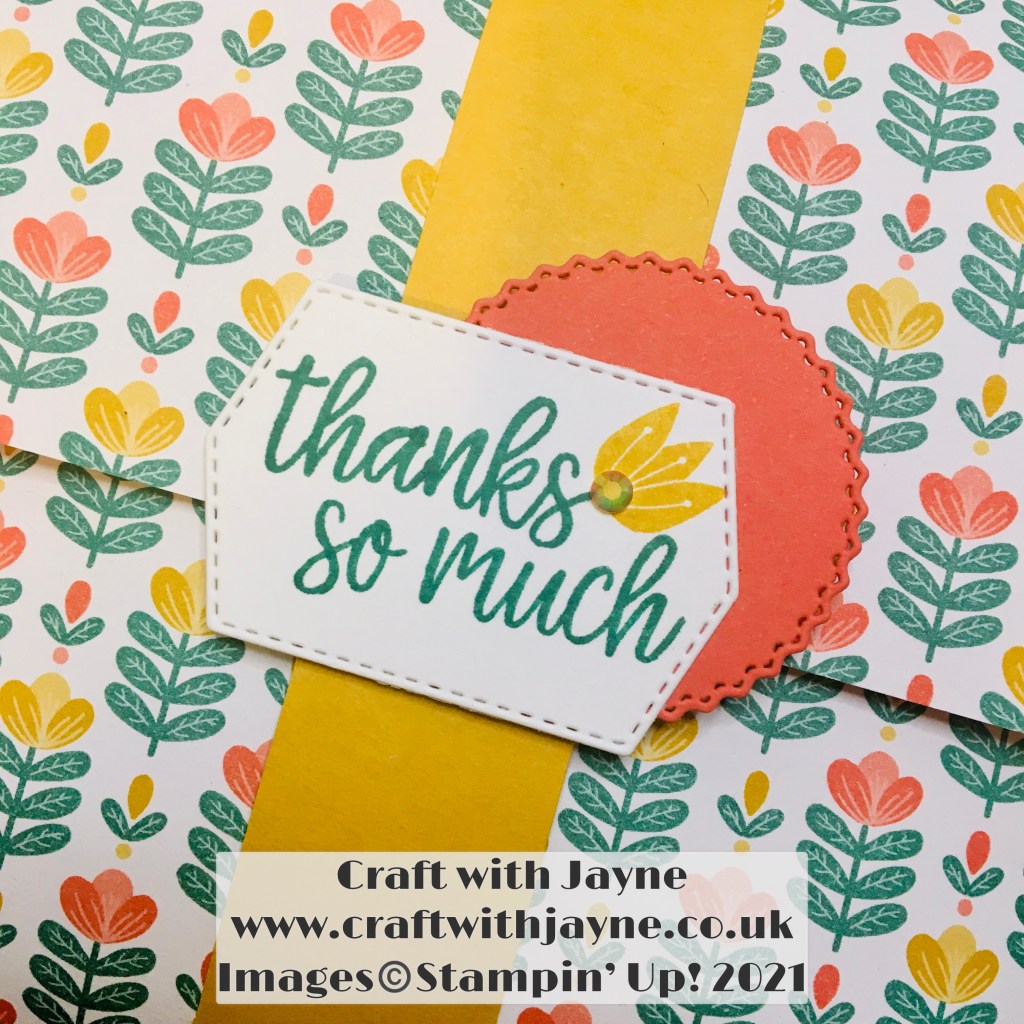The Belly Band is in the co-ordinating cardstock Bumble Bee which measured 11″ x 1″ (28cm x 2cm) and I used scraps of Calypso Coral and Just Jade Cardstock for the sentiment and decoration.