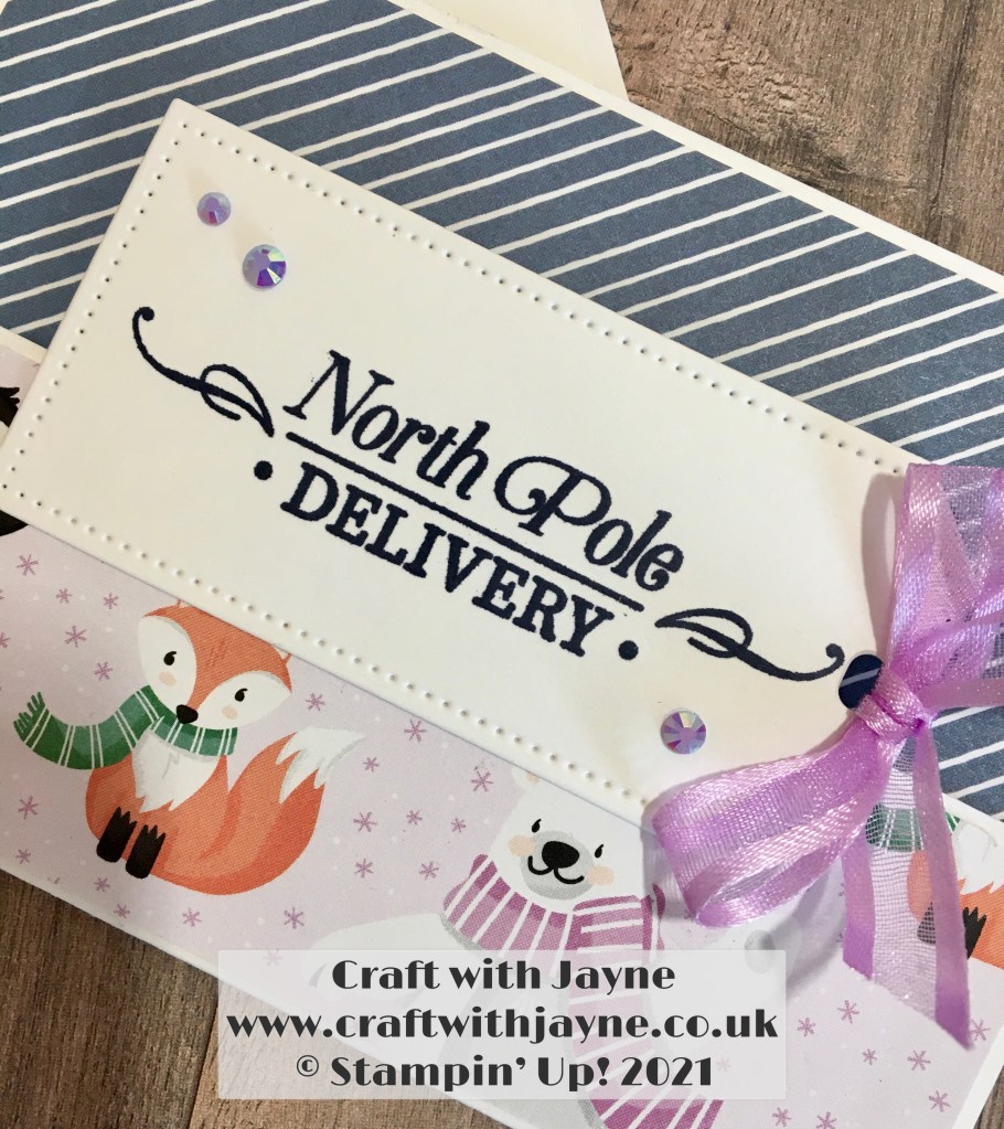 Project measurements, Instructions & product links: Basic White Notecard (pre scored), trim off 1 3/4″ (4.5cm) and round all 4 corners of the card. Cut Designer Series Paper layers 3 3/8″ x 4 7/8″ (7.5cm x 12.3cm) and 1 5/8″ x 4 7/8″ (4cm x 12.3cm), round the top corners on both pieces, then burnish and glue to assemble. Stamp and attach tag (tag can by die cut out of scrap from card trim), then attach ribbon and embellishments, finally decorate the envelope flap with co-ordinating DSP to finish.