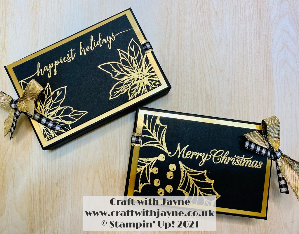 Project measurements, Instructions & product links: Cardstock measuring 8 12″ x 7 1/2″(23cm x 18.5cm), Score the long side at 3″, 4″, 7″ & 8″ (8cm, 10.5cm, 18.5cm & 21cm), then score the short side 1/2″, 1 1/2″, 6″ & 7″ (1cm, 3.5cm, 15cm & 17.5cm) then burnish, cut, mitre and glue to assemble the fold flat box. Mat Layers (Gold) 4 3/8″ x 2 7/8″ (11cm x 7.5cm) & Sentiment Top Layer 4″ x 2 1/2″ (10cm x 6.5cm). Heat emboss to decorate & embellish then assemble and fix mat layers to the box.