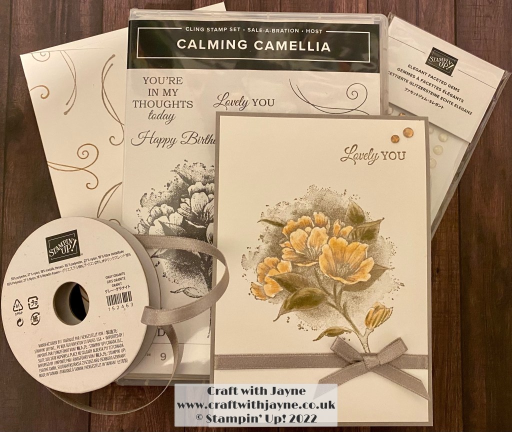 Project measurements & Instructions: A6 Card (top-fold) in Gray Granite with a Basic White front layer 14.4cm x 10.1cm. Stamped images using the FREE Sale-a-Braition ‘Calming Camellia’ Stamp Set in Gray Granite Ink. Wink of Stella applied using Petal Pink & Crumb Cake Inks to the flowers & leaves. Gray Granite Shimmer Ribbon to add a bow detail, finished with the Petal Pink Elegant Faceted Gems.