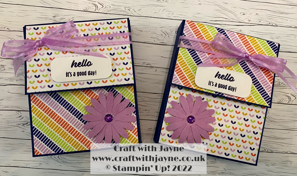 Project instructions and product links: Cardstock measuring 11 1/2″ x 4 3/4″ (29cm x 12cm), score the short side at 3/4″ & 4 ” (2cm & 10cm), then score the long side at 4″, 4 3/4″, 8 3/4″ & 9 1/2″ (10cm, 12cm, 22cm & 24cm), cut & mitre. DSP layers measuring 3 7/8″ x 3 1/8″ (9.5cm x 7.5cm) and 1 7/8″ x 3 1/8″ (4.5cm x 7.5cm), glue and decorate / embellish to finish.