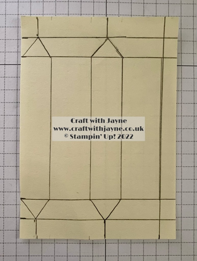 Project Instructions : DSP measuring 7 1/2″ x 4 1/4″ (19cm x 10cm), score the long side at 3/4″, 1 1/4″, 6 1/4″ & 6 3/4″ (2cm, 4cm, 15cm & 17cm). Score the short side at 1 1/8″, 1 7/8″, 3″ (2.5cm, 4.5cm & 7cm)between the 2nd and 3rd score lines and at 3 3/4″ the full length (9cm). Next score to the first line only at 1 1/2″ & 3 3/8″ (3.5cm & 8cm) then rotate to the opposite side and score to the first line only at 2″ & 3 7/8″ (4.5cm & 9cm). Complete the diagonal score lines, burnish and then glue the DSP along the long side to assemble the box, finally decorate / embellish to finish.