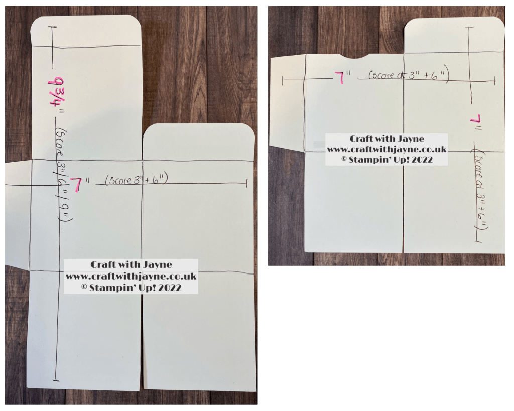 Project instructions: Card stock measuring 9 3/4″ x 7 ” (26.5cm x 18.5cm), score the short side at 3″ & 6″ (8cm & 16cm) and the long side at 3″, 6″ & 9″ (8cm, 16cm & 24). Card stock measuring 7″ x 7″ (18.5cm x 18.5cm), score both sides at 3″ & 6″ (8cm & 16cm). Cut (see the templates below), mitre and glue to assemble the gift box. X4 DSP layer’s measuring 2 7/8″ x 2 7/8″ (7.5cm x 7.5cm), glue layers into place and decorate / embellish to complete.