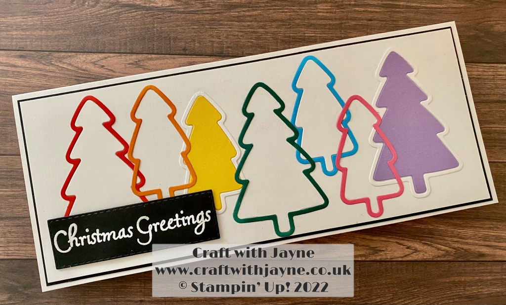 Project instructions and product links: Thick White Cardstock measuring 8 1/4″ x 7″ (21cm x 18cm) score the short side at 3 1/2″ (9cm), Basic Black mat layer measuring 8 1/8″ x 3 3/8″ (20.5cm x 8.5cm) and Basic White mat layer 8″ x 8 1/4″ (20cm x 8cm). Die cut the trees and tree outlines out of the cardstock colours you require, then glue all of the die cuts / mat layers into place and decorate / embellish to complete.