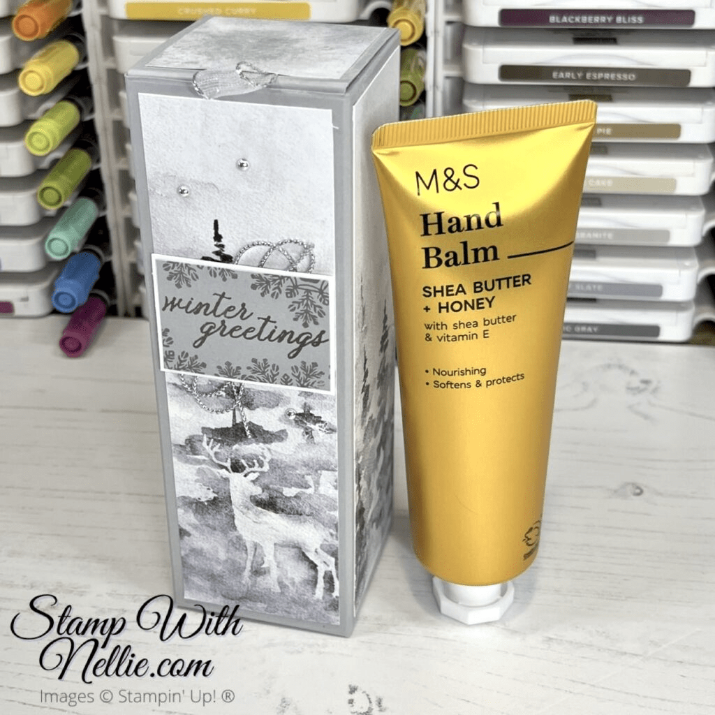 First up is Heather Forgan of http://www.stampwithnellie.com Heather has created this Beautiful tall gift box for some hand cream using the Winter Meadow DSP.