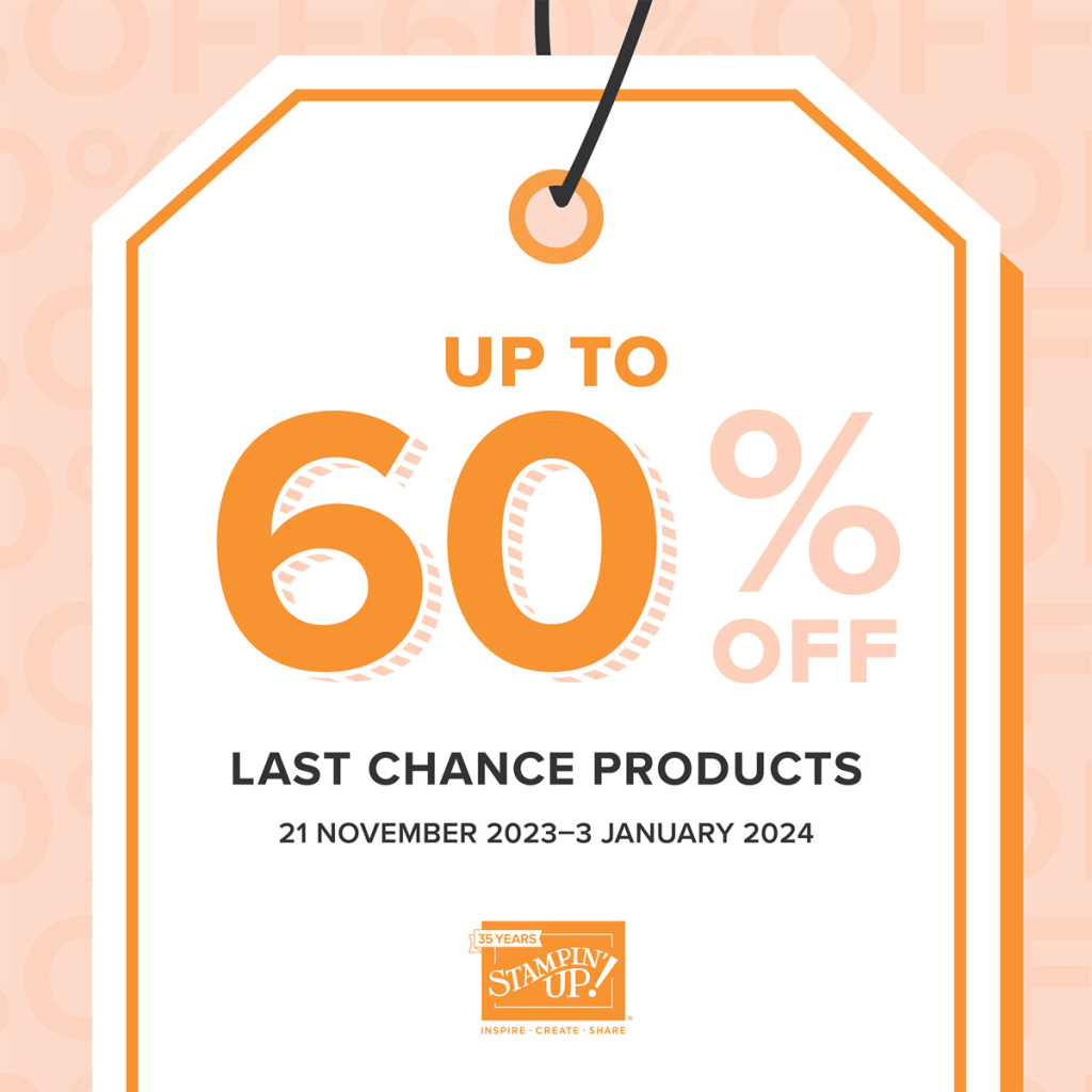 The September–December 2023 Mini Catalogue is retiring soon! It’s always bittersweet to say goodbye to a Stampin’ Up! catalogue, but I’m looking forward to all the new products on their way! From 21 November 2023 to 3 January 2024, you can stock up on your favourite seasonal products and save up to 60% on essential craft supplies! Last Chance Products will only be available while supplies last.