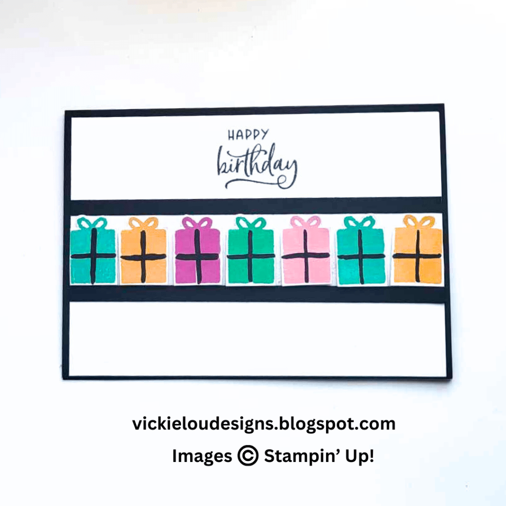 Finally its Victoria Littlewood of http://www.vickieloudesigns.blogspot.com Vickie has created this fun Birthday card using card scraps and the 2024-2026 In Color Ink Pads, the present image is from Labelled with Love stamp set.