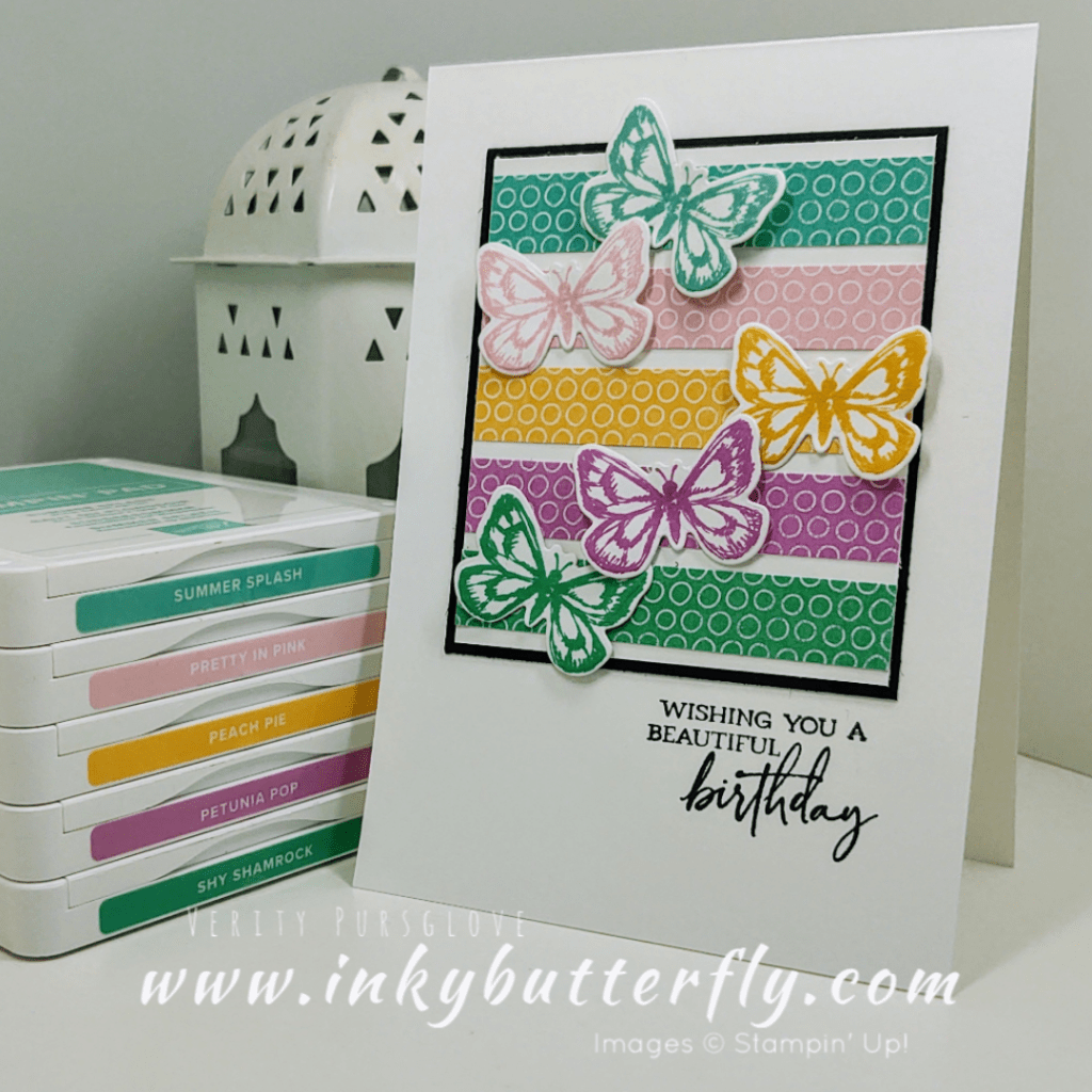 First up is Verity Pursglove of http://www.inkybutterfly.com – Verity has created this bright Birthday Card using the 2024 In Colors. Verity has used strips of co-ordinating DSP and stamped butterflies to create the colourful card front!
