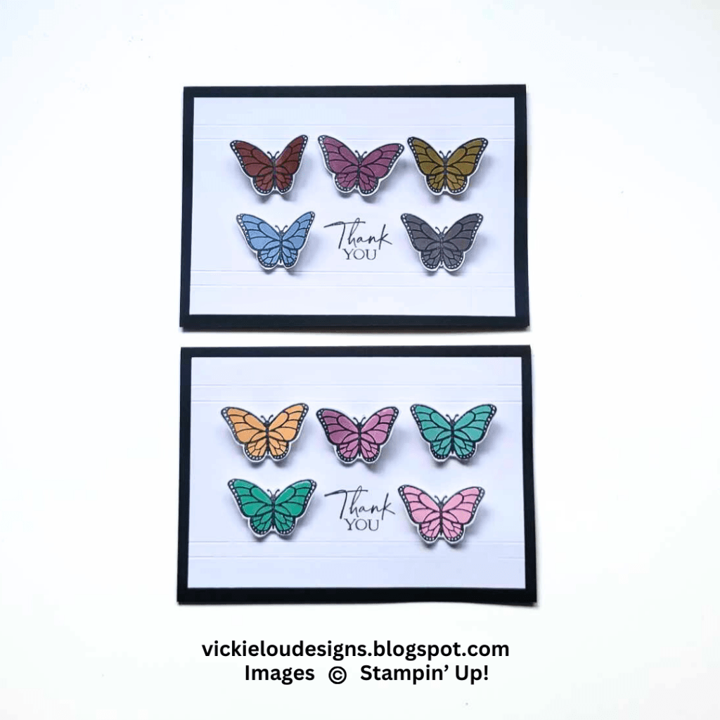 Finally its Victoria Littlewood of http://www.vickieloudesigns.blogspot.com Vickie has created these beautiful Butterfly Thank You cards using the Sketched Butterflies and Labelled with Love Stamp Sets. I love the rainbow effect and the clean and simple overall look of the cards!