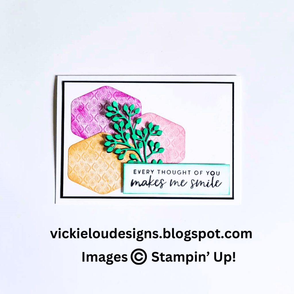 Finally its Victoria Littlewood of http://www.vickieloudesigns.blogspot.com Vickie has created this lovely frugal card using scraps and the Hexagon punch to design a unique card front, together with the ‘Textured Floral’ Bundle.